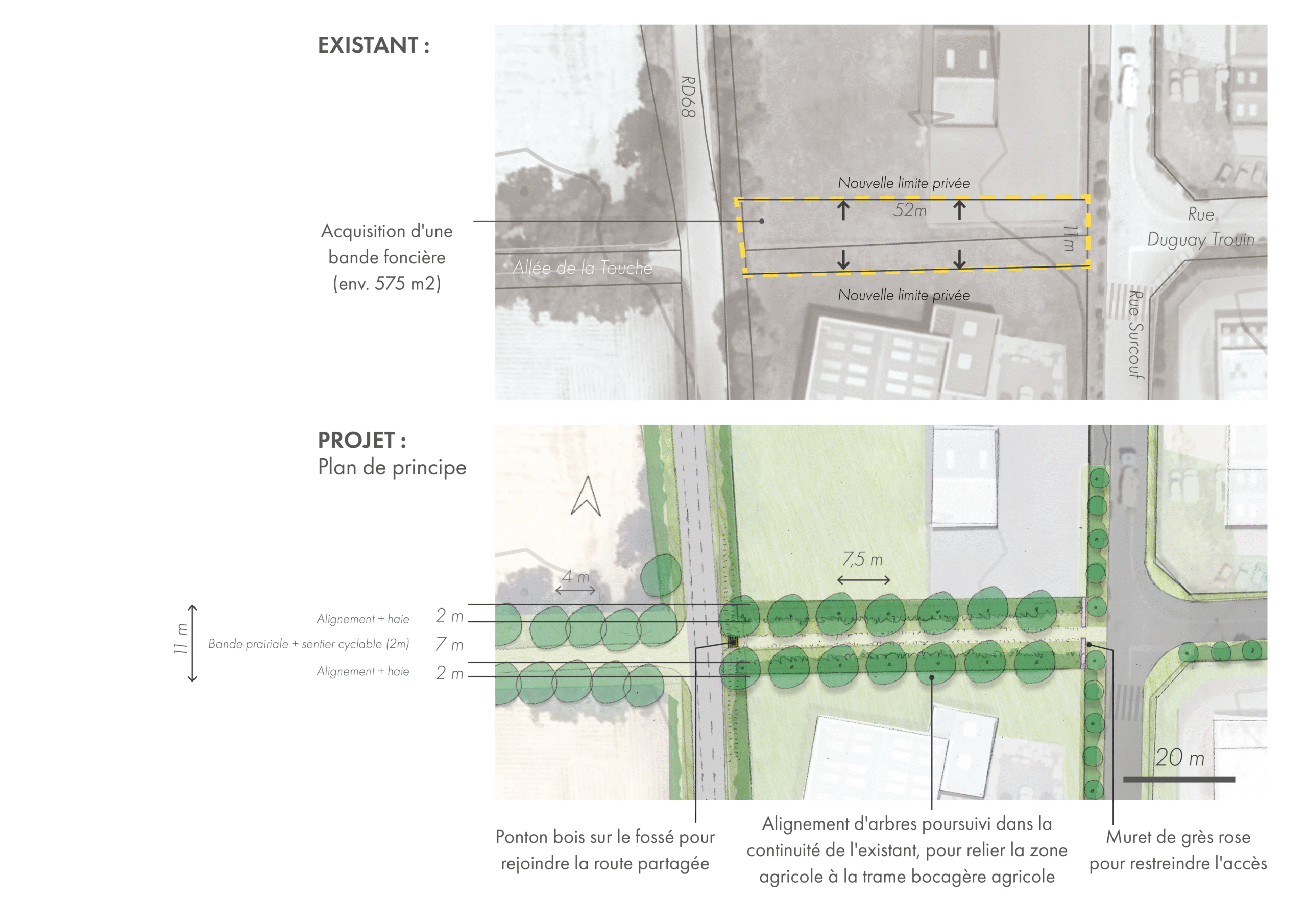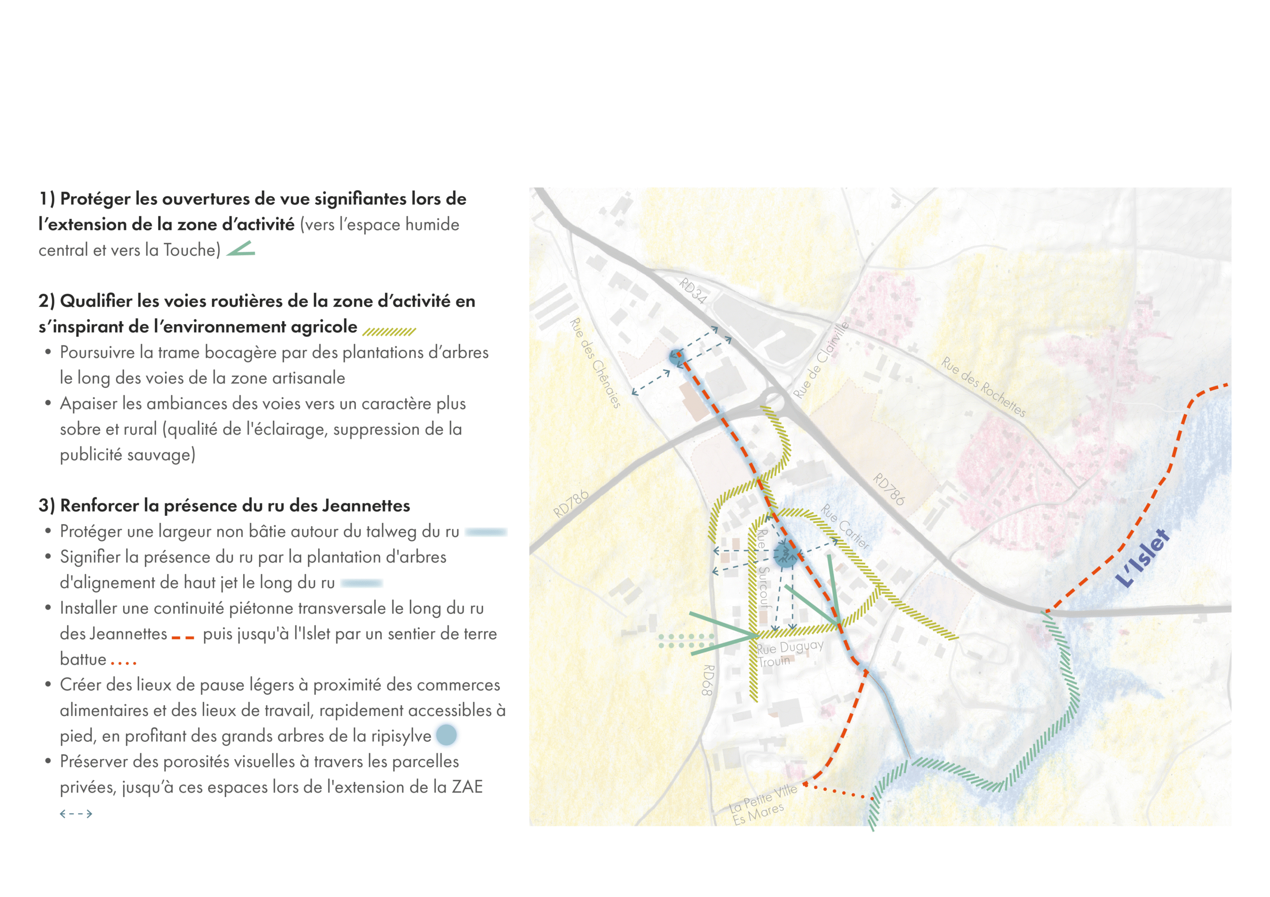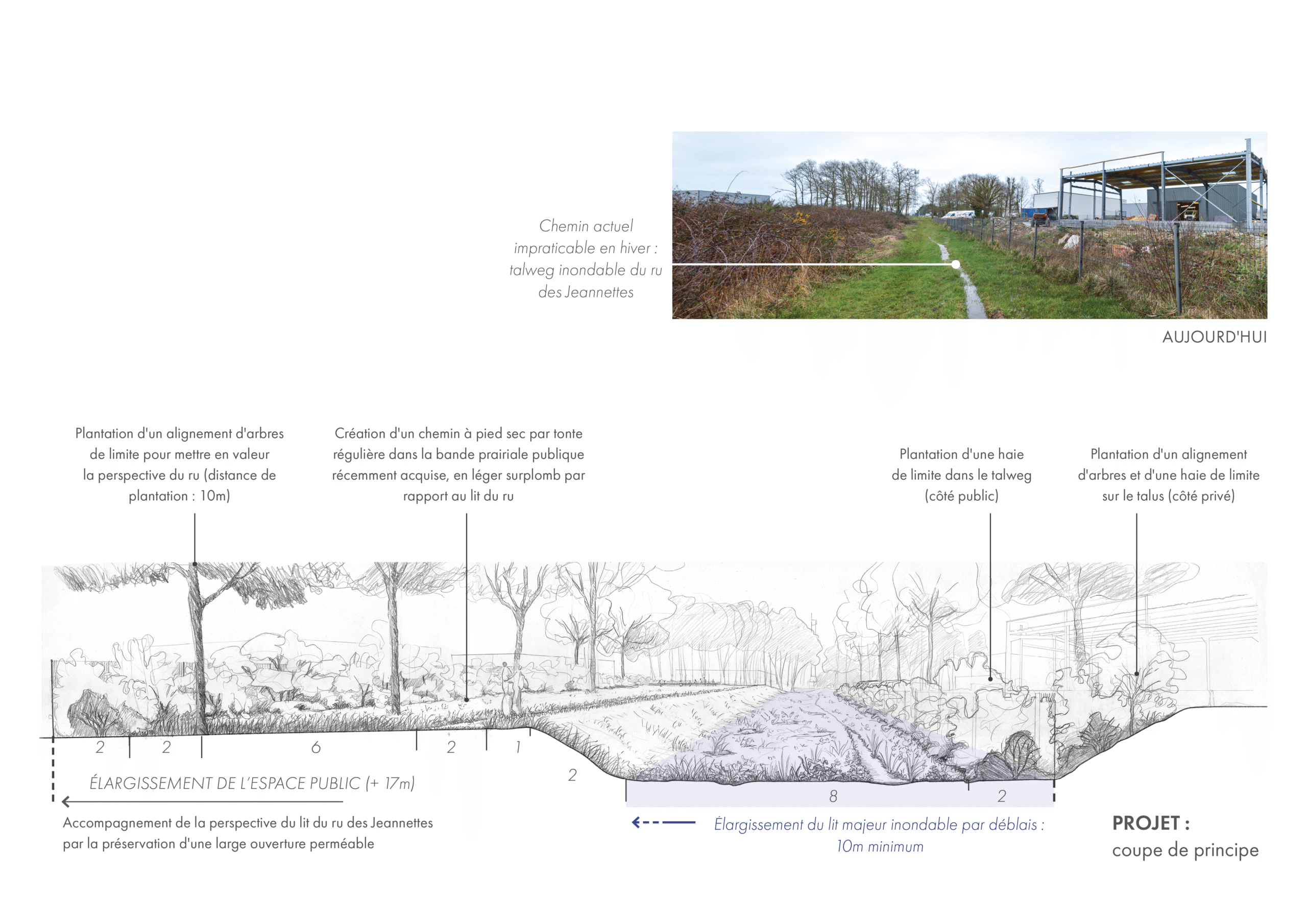 L’AVP programmatique des Jeannettes prépare donc la déclinaison opérationnelle du Plan de Paysage sur ce site pilote. Il est construit sous forme de coupes-type suffisamment précises pour être déclinées à petite échelle, progressivement et selon la disponibilité des financements des différentes maîtrises d’ouvrage concernées (LTM, ville d’Erquy, Département). Le projet vise d’abord à améliorer les premières impressions du Grand Site et de la ville d’Erquy par la mise en valeur des vues agricoles depuis les routes et par la contention de la zone d’activités dans les limites des chemins agricoles anciens qui la bordent. On cherche également à sécuriser les parcours quotidiens des cyclistes et piétons hors des routes rapides et très fréquentées, pour relier quartiers habités, commerces et lieux de travail. Enfin, pour améliorer l’expérience quotidienne de cet espace aujourd’hui standardisé et peu qualitatif, le projet tisse des liens entre la zone d’activités et son environnement bocager et humide. En particulier, on affirme la présence du ru des Jeannettes qui traverse toute la zone d’activités pour rejoindre le fleuve côtier de l’Islet en contrebas. Pour cela, de larges ouvertures non bâties et plantées sont préservées, garantissant la pérennité de cet écosystème humide. A la faveur des ambiances générées par ce ru, des espaces de vie collective sont créés pour les travailleurs de la zone d’activités : chemin piéton transversal et espaces de pause à proximité des grands arbres existants de la ripisylve.