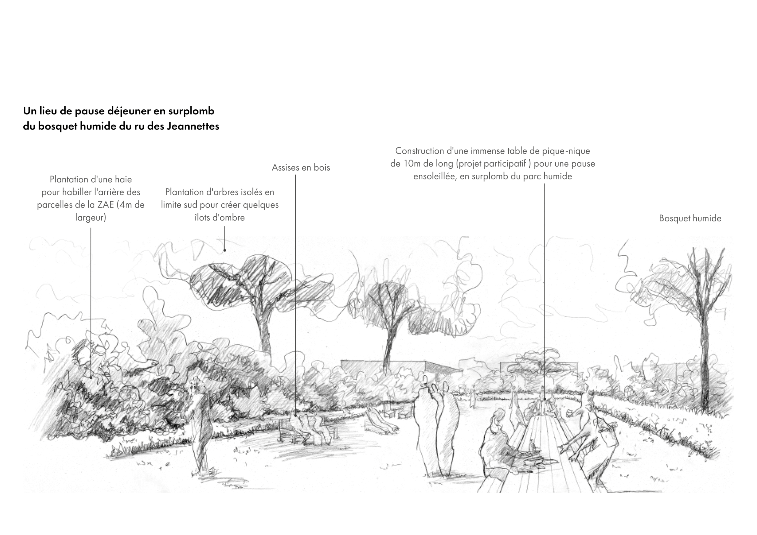 Projet : préserver l’écosystème humide tout en profitant de ses qualités paysagères : installation d’un lieu de pause déjeuner en surplomb du lit du ru