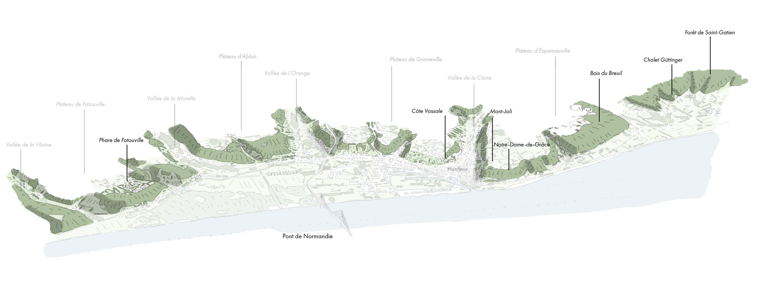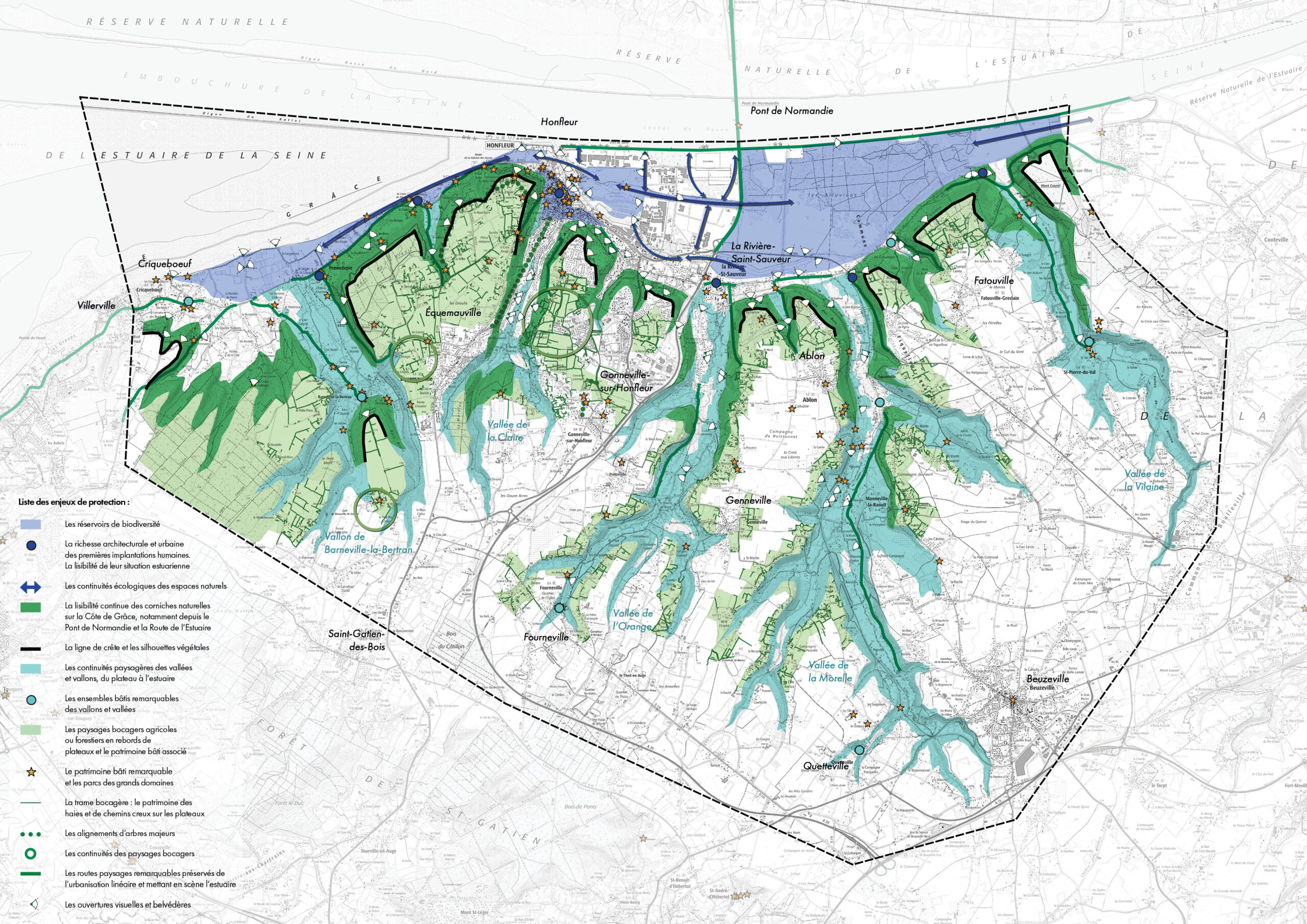 Le site des corniches et vallons de l’estuaire de la Seine est un espace naturel dont l’intérêt exceptionnel est en grande partie dû à sa situation estuarienne imbriquée au sein d’un territoire urbanisé et particulièrement soumis à la pression foncière. Fragile mais encore préservé, le site offre des belvédères remarquables sur les paysages pittoresques et monumentaux de l’embouchure de la Seine. De courtes vallées ouvertes et vallons intimistes offrent des respirations lumineuses et bucoliques. En rebords de plateaux, un bocage bien préservé, maillé de chemins creux et de talus plantés, tient l’urbanisation à distance et forme un écrin intensément arboré à de remarquables manoirs, châteaux et fermes normandes. Le paysage de la Côte de Grâce, baigné d’une lumière inspirante pour plusieurs générations d’artistes-paysagistes précurseurs, est un berceau du mouvement impressionniste. Il se découvre de façon spectaculaire par le Pont de Normandie, événement architectural majeur de l’estuaire de la Seine.
